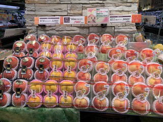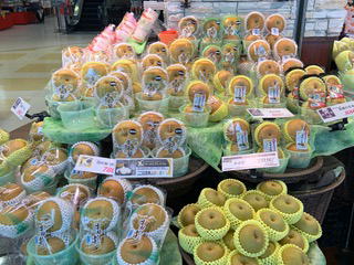 秋の季節らしい店の雰囲気や桃、梨などの商品構成が目に止まります。