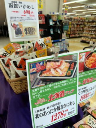 とうもろこし98円、北海道名物のいかめしなどのお弁当、秋鮭1尾1750円、など