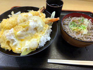 お昼に食べた市場内にある百万石うどんのカレーうどん、天丼とお蕎麦のセット。夜は、エムザの地下のテナント